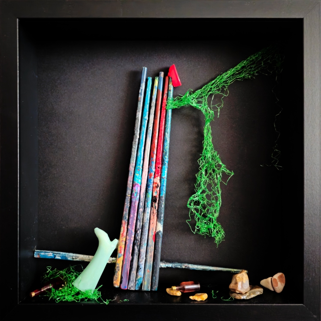 Kaikenlaisen tekemisen ja tekemättä jättämisen lopputuloksena on syntynyt monitekniikkateoksia, joiden raakamateriaalit, aihiot, kasvit, valokuvat, oivallukset ja ympäripyöristykset muuntautuvat Kuvittelukuvastoksi. Työskentely ja sen motiivit loikkivat pitkillä aasinsilloilla siihen pisteeseen saakka, että kaikki tuntuu aivan loogiselta. On katsojan ja kokijan asia, haluaako hän lähteä leikkiin mukaan.