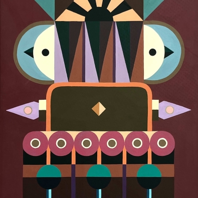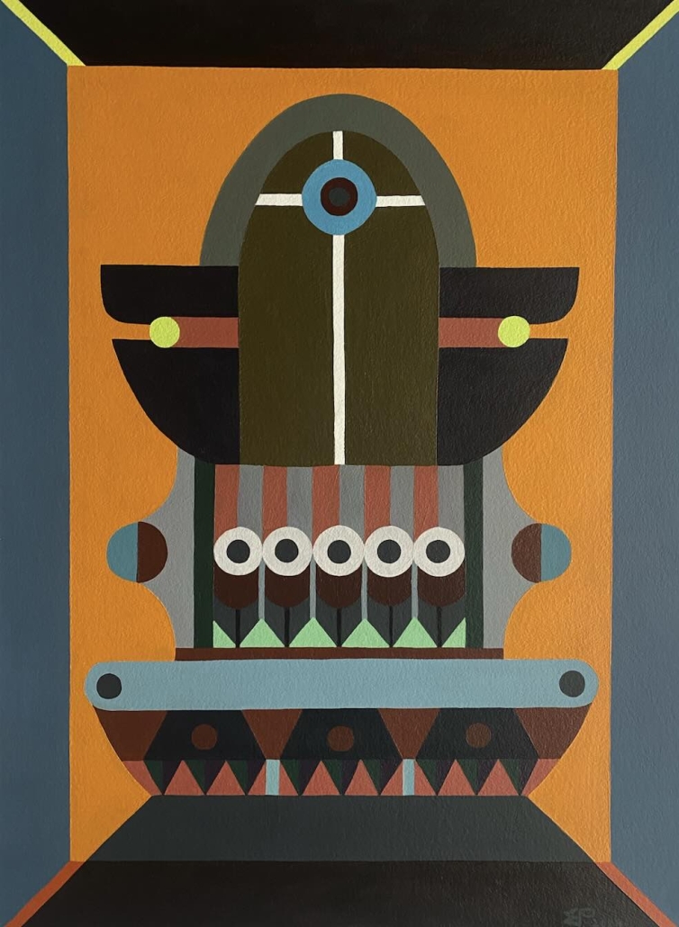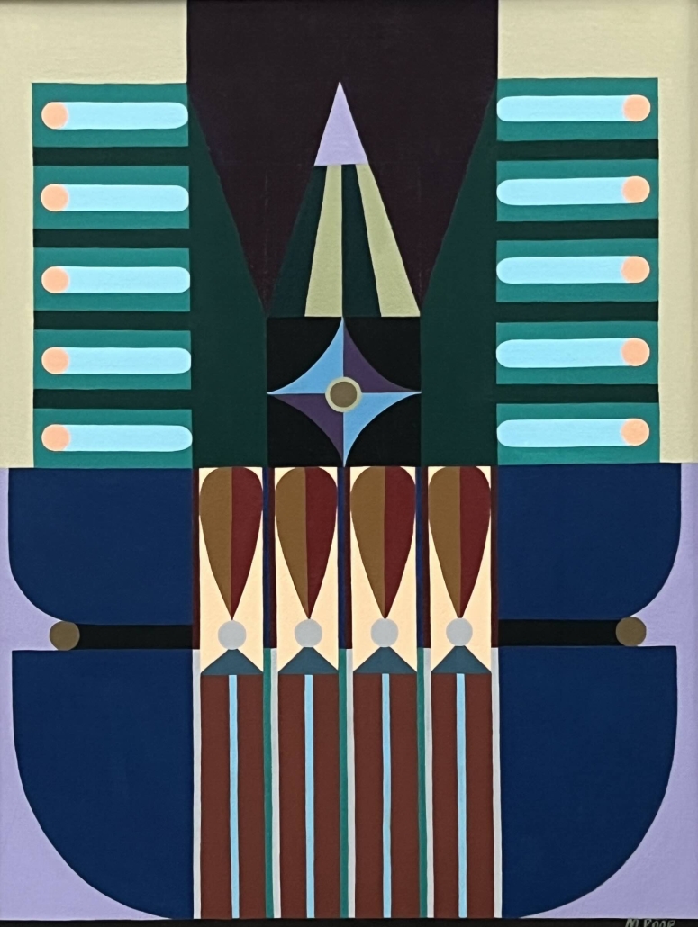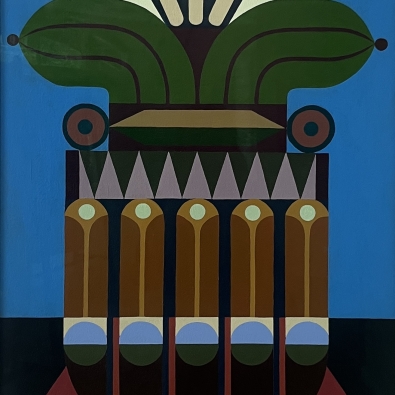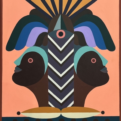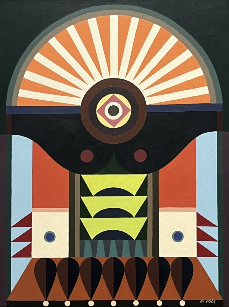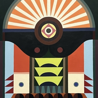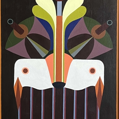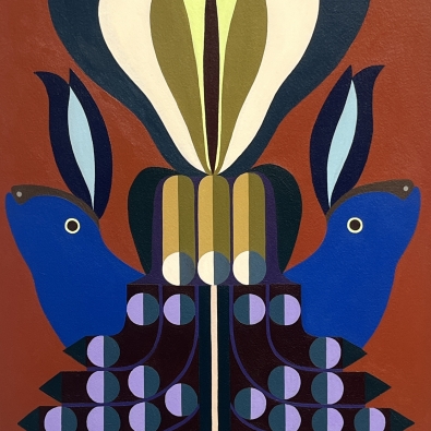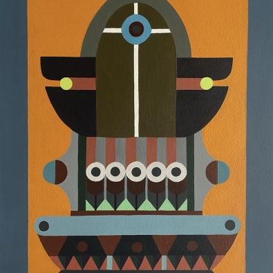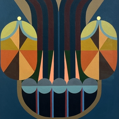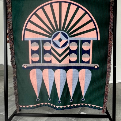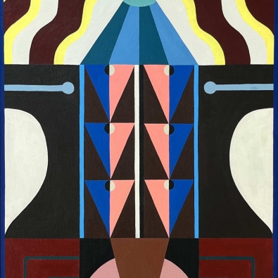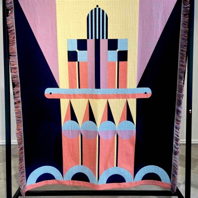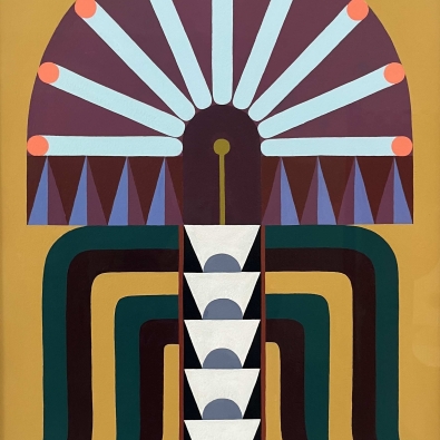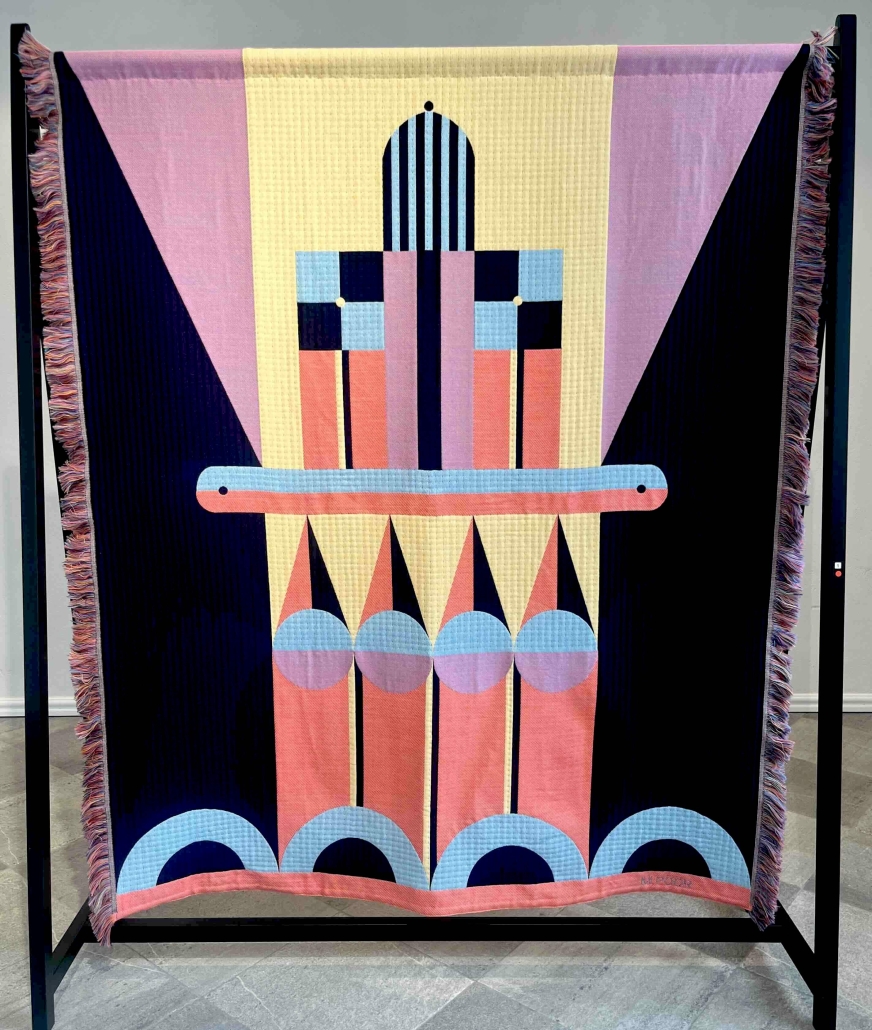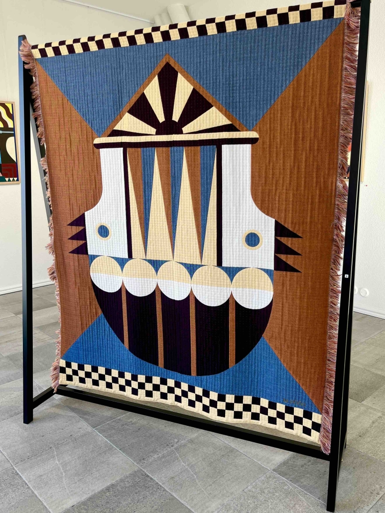 The exhibition is built on the interaction between two different forms of expression: Paintings explore architectural forms and color fields, highlighting the powerful yet delicate graphic nature of wooden construction. Textiles soften the rigid geometry and bring a sense of materiality to the works, evoking the coziness and craftsmanship of traditional homes.
